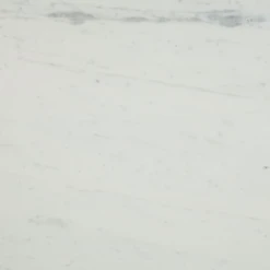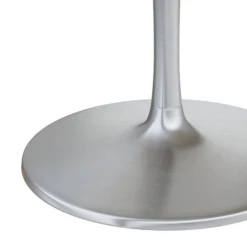 A modern dining table designed with a white marble top featuring unique grey veining and a tulip shaped base in a rich silver finish.