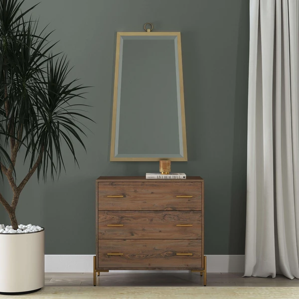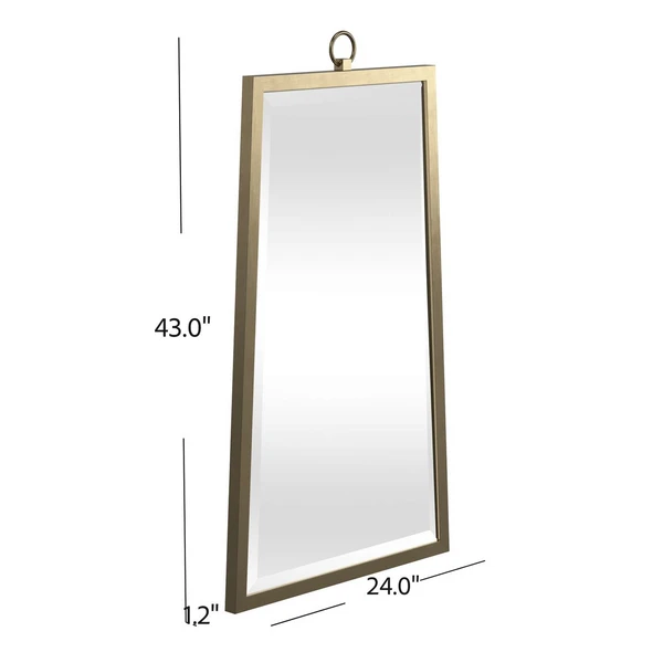 Our Finna Mirror is a rectangular shaped beveled mirror accented with a center ring finial in a brushed gold finish.