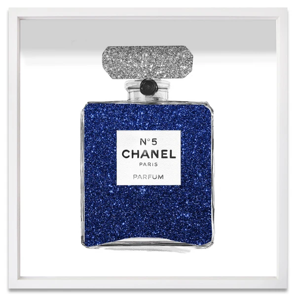 Featuring hand-applied glitter embellishments, this image of Chanel No. 5 adds a stylish, glam note to the wall. Printed on paper, this piece is displayed in a white shadowbox frame.