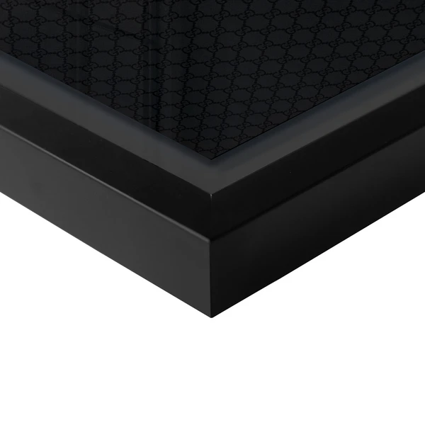 - Mounted within a high gloss black wood shadowbox frame and set under plexiglass.