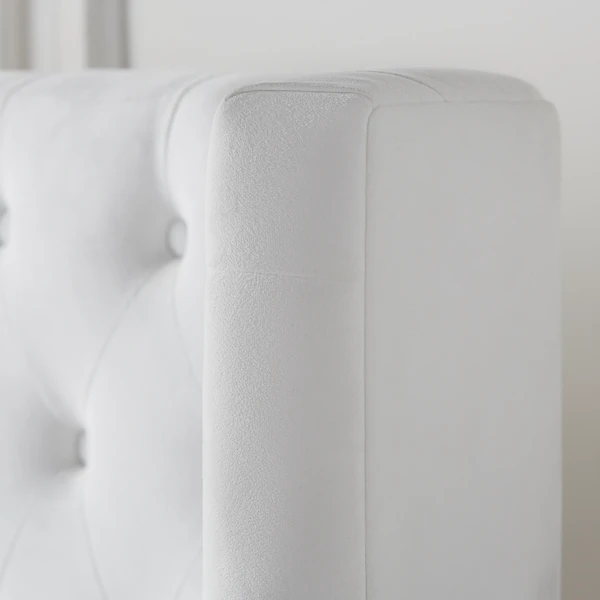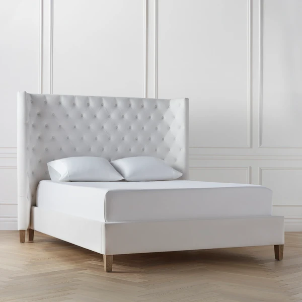 Inspired by designs found in the chicest Parisian hotels, our Jen Collection makes a glamorous, refined statement in the bedroom. Framed in kiln-dried hardwood, each features a gently curved wingback-style headboard and neatly tailored upholstery with hand-applied button tufts in a lavish diamond pattern. Shown in Bella Velvet White.