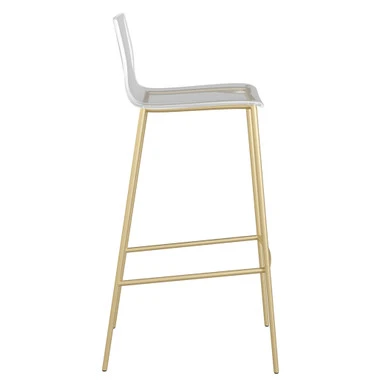 Sleek and modern, this pair of barstools flaunt beautifully contoured clear acrylic seats atop clean-lined steel frames finished in matte, brushed gold.