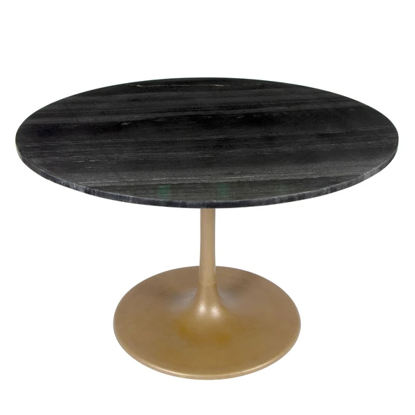 A modern dining table designed with a black marble top featuring unique white veining and a tulip shaped base in a rich gold finish.