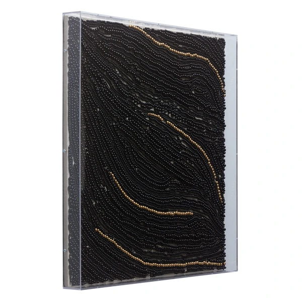 Perfect for adding texture, drama, and shine to your wall, this captivating composition features strands of black and gold beads displayed in a clear acrylic shadowbox frame.
