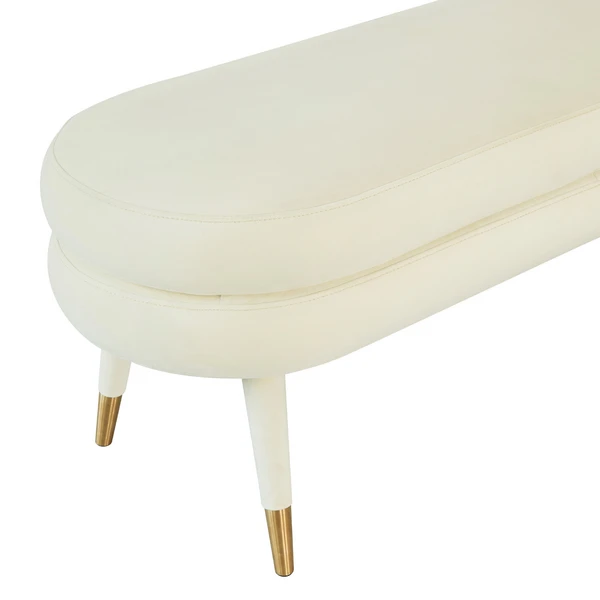 Upholstered in plush cream velvet and perched on gold-tipped cone legs, this bench brings glamorous style to any space. Generous padding ensures long-lasting comforts.