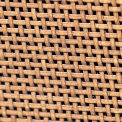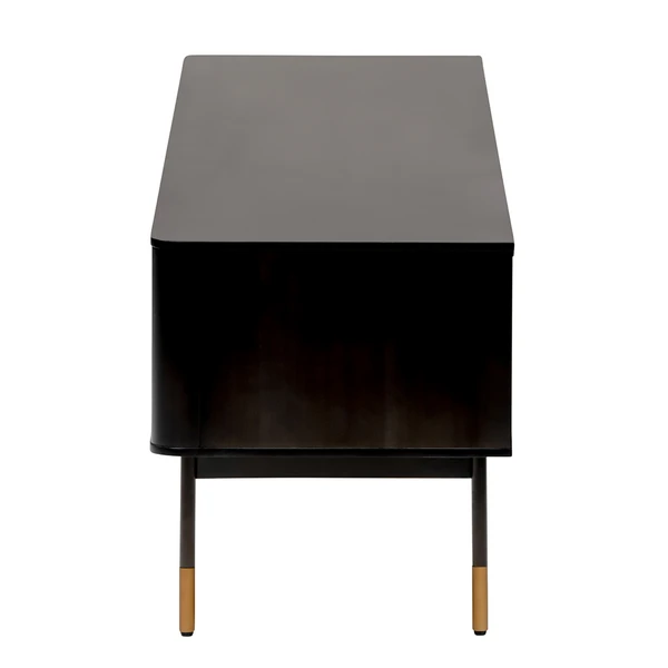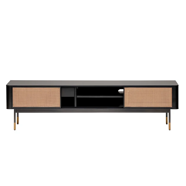 The Mabel Media Stand features a solid wood outer frame and steel legs with bronze lower accents. There are two wicker sliding compartment doors with magnetic door holders to set the doors in place. The media stand features two outer pull out drawers with three shelves for storage. The upper center shelf has a hole cut out to manage wires, perfect for your living room.