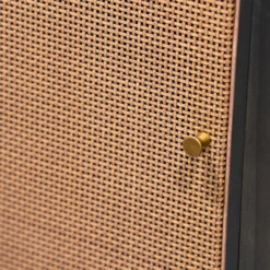 The Mabel Sideboard, with its contemporary lines, is as stunning as it is functional. This 59-inch sideboard features a solid wood outer frame and steel legs with bronze lower accents. There are two wicker sliding compartment doors with brass handles, that enclose ample space and shelves for convenient storage. The two center pull out drawers features smooth lower glides which gives the sideboard a clean and sleek look.