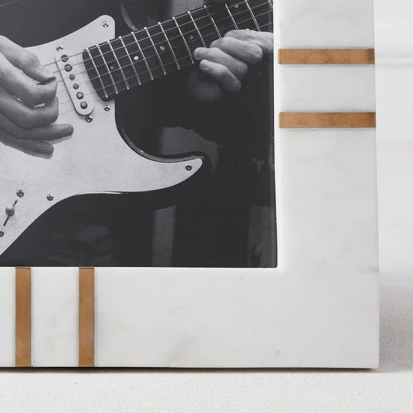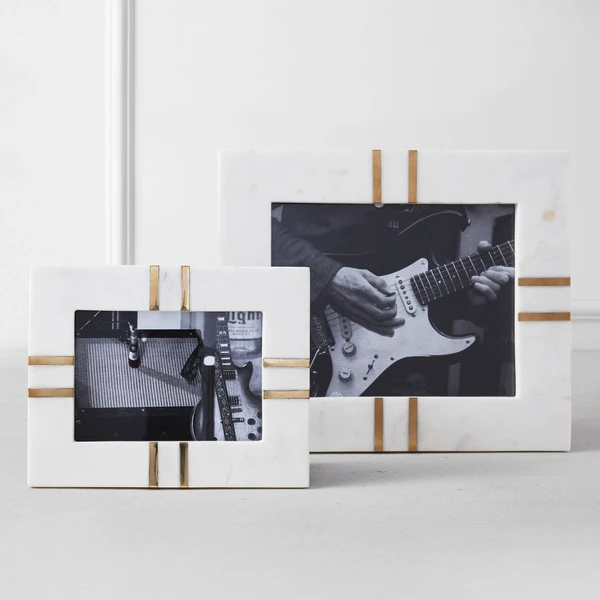 The Markham frame is a vision in white marble with gold detailing. A substantial piece for your surface, it coordinates easily with any decor. Proudly display your photos to create a story in combination with the Miller frame, for example. Available in two sizes.