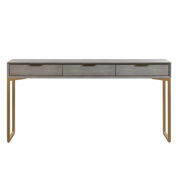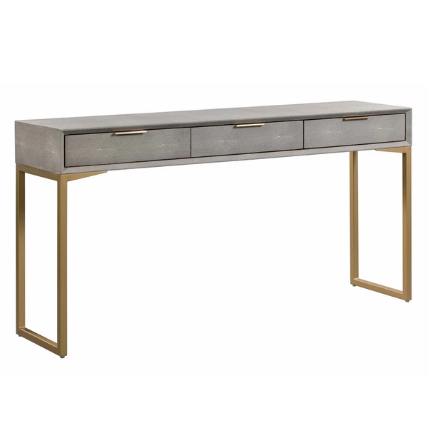 Perched on brass-finished legs and clad in faux shagreen, this console brings sleek, modern style and luxe texture to any space. Three drawers with cherry wood stained interiors and stylized hardware offer plenty of room for concealed storage.