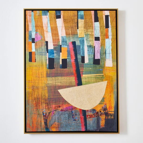 Printed on canvas with hand-applied impasto gold embellishments and set in a gold frame, this striking work from Nikki Chu lends a modern mood and vibrant color to the wall.