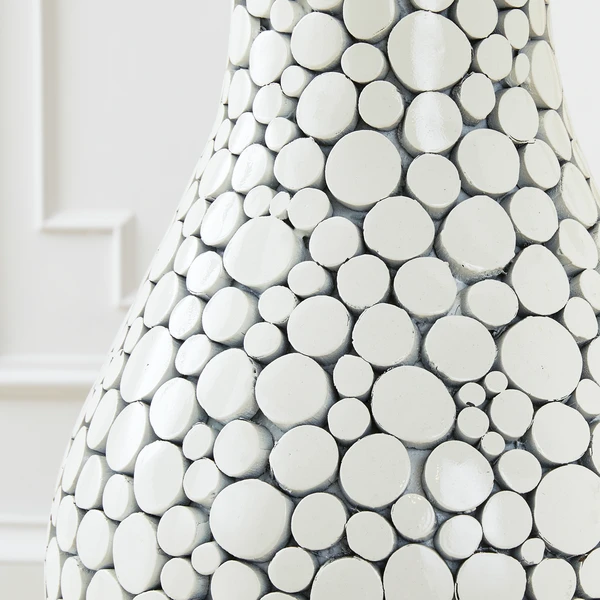 We’ve combined clean, contemporary design with the organic sensibility of natural materials to create our exclusive Oslo vase. The simple shape of the large vase is crafted in a base of fiberglass, with a hand-applied overlay of intricately arranged flat coin-shaped pieces of wood. A smart glossy White finish accents the modern appeal.