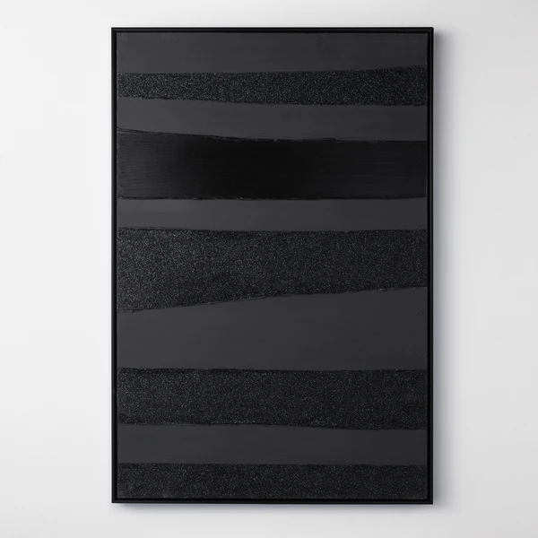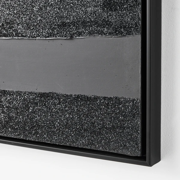 Artist Savannah Yanni makes a monochromatic statement with her Power Power Series. This piece is the black on black choice, which is 100% hand painted on canvas with glitter embellishments. Set in a black floater frame, this is 1 of a series of 2.