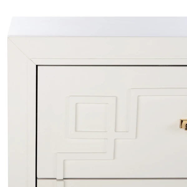 A fabulous display of modern sophistication, this Preston Six Drawer Dresser exudes chic couture style. A classic Greek key pattern is paired with a sleek white hue and polished brass hardware for matchless fashion flair.