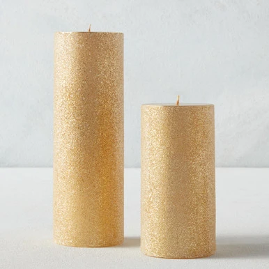 With its shimmering finish, this unscented pillar candle helps set a glam, festive scene.
