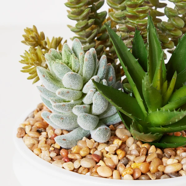 The premade arrangement of faux succulents in a matte white bowl is a visually stunning and modern centerpiece that brings nature’s beauty into any space.