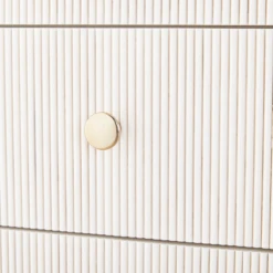 Elevate the style of your bedroom with our Viola nightstand. Featuring a sleek, modern silhouette and unique reeded drawer fronts, this nightstand is sure to catch your eye. The bone white finish and brass hardware add a touch of luxury to the overall design.